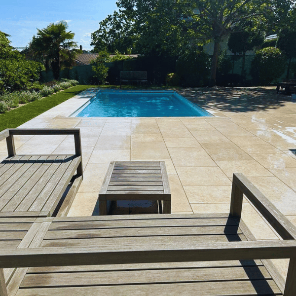 - Utilisation de pavés et de dalles en pierre naturelle tels que le travertin ou le grès ou au choix du client.